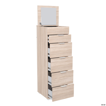 • Комод Наоми-6 оснащен пятью выдвижными ящиками и отсеком с откидной крышкой с амортизатором для фиксации, откидная крышка комода оснащена зеркалом. Комод очень удобен, так как не занимает много места и совмещает в себе функции комода и трюмо.