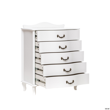 • Идеальный классический комод для изысканной спальни. Пять удобных выдвижных ящика позволяют наиболее функционально использовать пространство и объем комода. Материалы, из которых выполняется комод, обеспечивают высочайшую надежность.