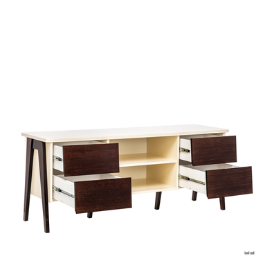 • Акценты в новой модели ТВ-тумбы расставлены правильно – экологичные материалы, мягкий дизайн и прочный каркас. В основе продукта заложен принцип функциональности для комфортного ежедневного использования. Конструкцией предусмотрена открытая секция для техники с задней стенкой и вместительные ящики с плавным закрыванием.