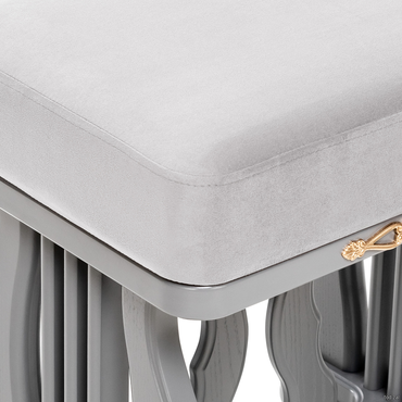 • Банкетка с мягким сидением и изогнутыми опорами необычной формы выполнена из массива дерева. Сиденье обтянуто мебельной тканью высокого качества. Надежные опоры банкетки придают ей устойчивость. Банкетка станет отличным дополнением к туалетному столику «Джульетта».