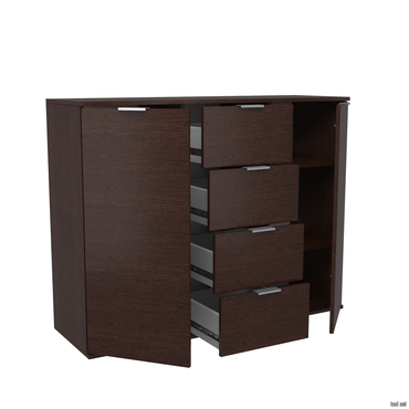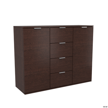 - Комод Нолан-4 с разными вариантами ящиков: четыре выдвижных расположены посередине, по бокам: ящики с распашными дверцами. Комод поможет разместить вещи любого размера в удобном порядке.