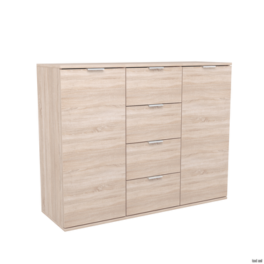 - Комод Нолан-4 с разными вариантами ящиков: четыре выдвижных расположены посередине, по бокам: ящики с распашными дверцами. Комод поможет разместить вещи любого размера в удобном порядке.