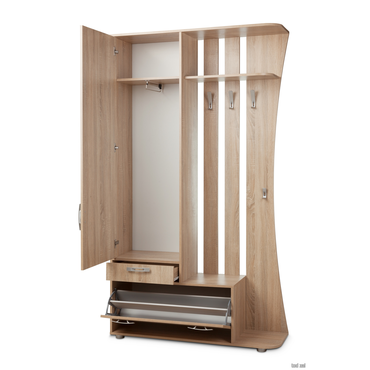 - Компактная, но выполняющая все необходимые функции, прихожая. Включает в себя: два выдвижных ящика, шкаф для верхних вещей с зеркалом на дверце, вешалку с крючками для сезонной одежды и зонтика с ручкой, полку для хранения головных уборов.Ящики в прихожей разной величины: один предназначен для хранения шарфов, перчаток или домашних мелочей, другой представляет из себя обувницу с двумя горизонтальными отсеками для обуви.Прихожая универсальна при сборке, зеркало может быть расположено с любой стороны. Изготовлен из качественной ЛДСП, кант мебели обработан ПВХ. Размер зеркала составляет (ВхШ): 100 х 3,7 см.