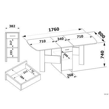 - Многофункциональный стол-книжка с ящиками и полочками. Полезный элемент в квартире или загородном домике. В собранном виде может использоваться в качестве тумбы (ширина всего 38,2 см). А при необходимости модель превращается в полноценный обеденный стол шириной 176 см. Внутренние размеры ящиков составляют — 21,1 х 35,4 см. Стол выполнен из ЛДСП толщиной 16 мм. Рекомендуем сохранить инструкцию по сборке (паспорт изделия) до истечения гарантийного срока.