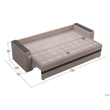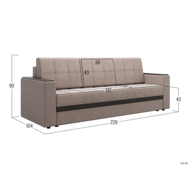 - Стильный прямой диван Атланта подходит для оформления интерьера любой комнаты, а декоративные стяжки на подушках делают эту модель особенно привлекательной. Надежный и удобный механизм трансформации быстро превращает диван в полноценное спальное место. Модель дополнена двумя деревянными подлокотниками и вместительным ящиком для постельных принадлежностей. Характеристики: Размер спального места: 148х197 см. Механизм трансформации: еврокнижка. Нагрузка на одно спальное место: 120 кг. Нагрузка на одно посадочное место: 90 кг. Посадочное место (ВхГ): 43 х 60 см. Посадочное место без подушек (ШхГ): 197 х 75 см. Размер подлокотников (ВхШхГ): 60 х 104 х 14 см. Приспиннаяя подушка (ВхШхГ): 43 х 66 х 20 см (3 шт.). Материал каркаса: массив сосны, ДСП. Наполнение: плоские пружины «змейка», пенополиуретан. Набивка подушек: пенополиуретан. Высота опор: 3 см. Материал ножек: пластик. Преимущества: механизм трансформации «Еврокнижка» — надежный и простой в использовании механизм. Спальное место без стыков, которое располагается вдоль. Чтобы трансформировать диван, нужно выдвинуть сиденье вперед и опустить спинку на освободившееся место. Подходит для ежедневной эксплуатации; ящик для хранения — в просторном коробе уместится все: от постельного белья и объемных подушек до сезонных вещей и коробок с обувью; ткань со всех сторон — диван со всех сторон обит одним материалом, поэтому будет эстетично смотреться даже в центре комнаты. Идеален для зонирования пространства и больших помещений; комфортный сон и защита стены — защищает спящего от соприкосновений с холодной стеной, а настенное покрытие — от потертостей и пятен. Обратите внимание, изделие поставляется в разобранном виде: необходима установка подлокотников.