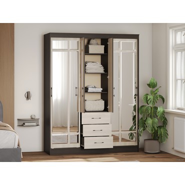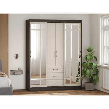 - Большой и вместительный шкаф-купе Маэстро заменит собой небольшую гардеробную. Благодаря наличию полок, ниш, ящиков и двух секций со штангами для вешалок он невероятно удобный и функциональный. Высокий шкаф заметно экономит пространство в комнате. А большие зеркала визуально делают помещение просторнее и светлее. Функциональное наполнение: два отделения со штангами для вешалок, полки и три выдвижных ящика, высокие зеркала. Декоративный: фацетная обработка кромки зеркал, двухцветные ручки, контрастное сочетание фасадов и корпуса. Вместительный: длинная стационарная штанга для вешалок. Безопасный: зеркала с фацетной кромкой. Функциональный: два платяных шкафа, полки, ящики, высокие зеркала. Направляющие: СТ, сверху алюминий, снизу пластик. Внимание! Данный шкаф требует много места для сборки. Конструкция шкафа предполагает его сборку в горизонтальном положении (лежа). Для того, чтобы шкаф можно было поднять из положения «лежа», высота потолков должна быть больше высоты шкафа не менее, чем на 10 см. Сборка шкафа в вертикальном положении (стоя) гораздо более трудоемкая и часто приводит к повреждению деталей. Боковины ящиков закромлены только с одной стороны, сборку необходимо осуществлять строго по инструкции.
