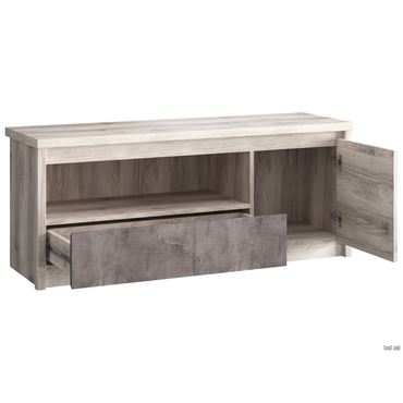 - ТВ-тумба Джаз станет стильным и незаменимым помощником для оформления гостиной. Благодаря нескольким нишам для хранения, модель позволит удобно разместить всю необходимую технику и множество других полезных предметов. Преимущества: функциональность — модель оснащена выдвижным ящиком, открытой полкой и нишей за распашной дверцей; открытая ниша под столешницей — позволит разместить аудио- и видеотехнику или игровую приставку; отверстие для проводов — поможет аккуратно спрятать провода аппаратуры за стенкой тумбы; модульная серия — можно создать композицию гостиной в едином стиле. Характеристики: Материалы корпуса: ЛДСП, кромка ПВХ. Материалы фасада: ЛДСП, меламиновая бумага, кромка ПВХ. Задняя стенка выполнена из ДВП. Ручка выполнена из металла. Тип направляющих: шариковые. Петли оснащены доводчиками. Модель подходит для телевизора диагональю от 50 дюймов. Глубина ящика: 32 см. Глубина открытой полки и ниши за дверцей: 37,1 см.Максимальная нагрузка на ящик: 5 кг. Модель собирается только так, как представлено на фото.