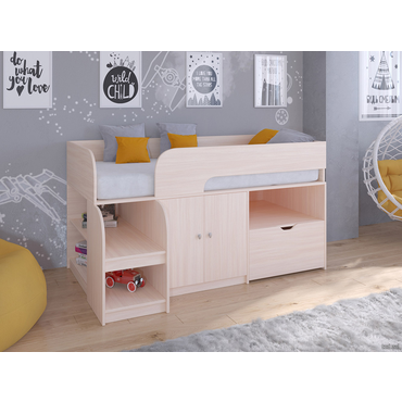 - Невысокая детская кровать-чердак Астра 9/4 — это компактный размер и практичное исполнение, дополненные разнообразием цветовых решений. Модель подойдет к практически любому интерьеру детской комнаты. Характеристики: Материал каркаса: ЛДСП 16 мм. Высота спального места от пола: 60 см. Рекомендуемая высота матраса: до 17 см. Высота бортика: 30 см. Максимальная нагрузка на спальное место: 100 кг. Ориентация сборки: универсальная. Наполнение: открытые полочки, выкатной ящик, распашной шкафчик с полкой. Обратите внимание, матрас в комплект не входит, его необходимо приобрести отдельно.