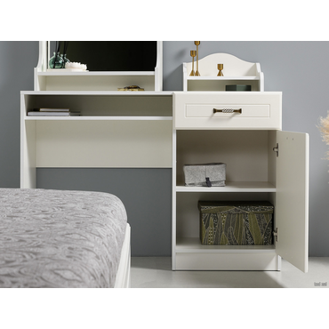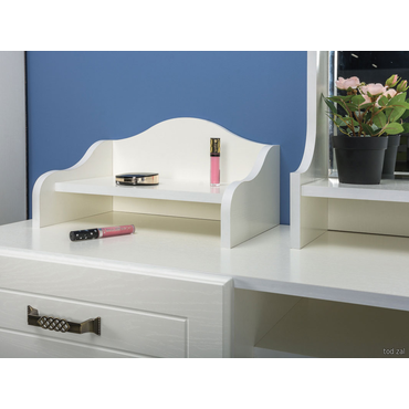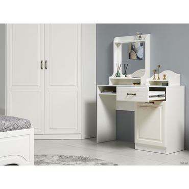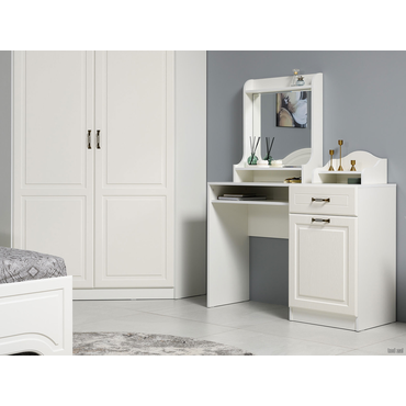 - Стандартная комплектация туалетного столика Ливерпуль представлена вместительной тумбой с выдвижным ящиком для аккуратного размещения средств по уходу. В ящике установлены шариковые направляющие, которые обеспечивают полное выдвижение и тихий ход. Также модель можно дополнить классическим зеркалом и/или подставкой для парфюмерии и аксессуаров. Характеристики: Материал корпуса: ЛДСП 16 мм. Материал фасада: МДФ 16 мм. Материал ручек: металл. Тип направляющих: шариковые. Габариты подставки для парфюмерии (ВхШхГ): 200 х 38 х 25 см. Габариты надстройки с зеркалом (ВхШхГ): 70 х 60 х 20 см. Ориентация сборки: универсальная.