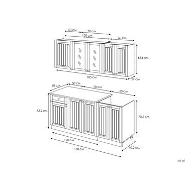 - Кухонный гарнитур Хозяюшка 180 см выполнен в теплых оттенках с имитацией текстуры натурального дерева, что выглядит одновременно стильно и уютно. В комплект входят (ВхШхГ): Шкаф 1 дверь + 2 двери со стеклом: 62,6 х 120 х 29 см. Шкаф 2 двери: 62,6 х 60 х 29 см. Стол под мойку: 84 х 60 х 42 см. Стол 3 двери 1 ящик: 84 х 120 х 42 см. Столешница: 2,6 х 120 х 60 см. Характеристики: Материал корпусов: ЛДСП. Материал фасадов: МДФ, матовое стекло. Тип направляющих: роликовые. Глубина нижних шкафов: чистая — 40 см, с дверцами — 42 см. Опоры: регулируемые по высоте. Цвет столешницы: Калаката. Толщина столешницы: 26 мм. Преимущества: компактные габариты — прекрасно подойдет для небольшой кухни; прочная цельная столешница — легко чистить, не требует специальных моющих средств и дополнительной герметизации; комбинированное наполнение — гарнитур состоит из нескольких шкафов и столов, которые позволяют хранить и содержать в порядке большое количество кухонной утвари; ножки закрыты цоколем — предотвращает попадание мелких предметов и мусора под мебель. Обратите внимание, стол под мойку не комплектуется столешницей. Мойка, сушилка и стеновая панель в комплект не входят. Предусмотрен стол для накладной мойки, которая подбирается исходя из ширины модуля под мойку и глубины столешницы соседних модулей.