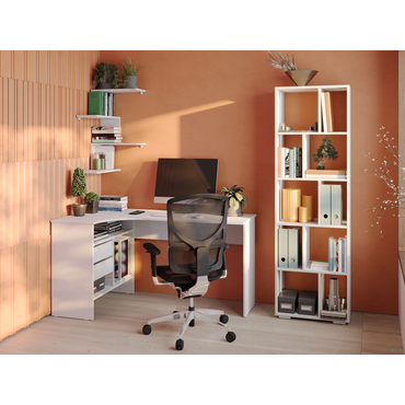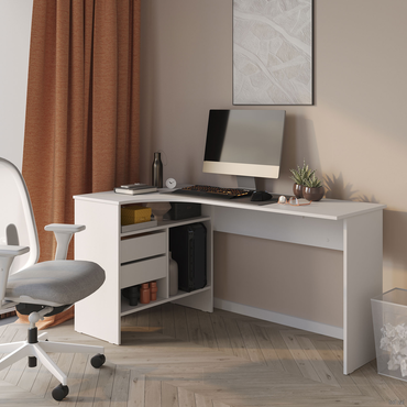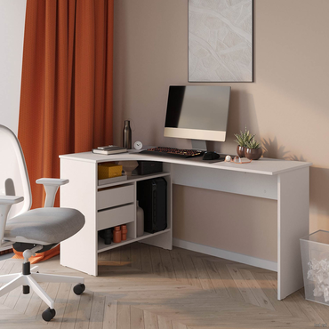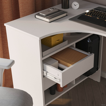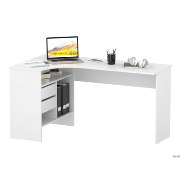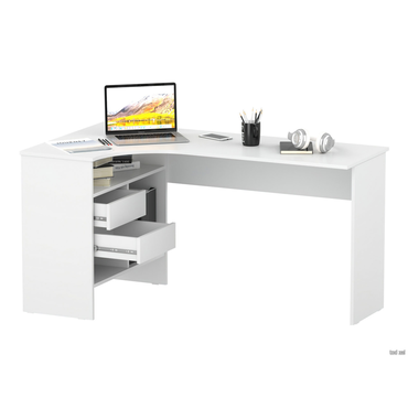 - Угловой письменный стол Шепард — идеальное решение для обустройства полноценного рабочего места в домашнем кабинете или офисе. На широкой столешнице найдется место для большого монитора, клавиатуры или ноутбука, а также сопутствующей техники. В выдвижных ящиках и открытых отделениях удобно хранить книги и канцелярию. Преимущества: Много мест для хранения. Открытые ниши и выдвижные ящики позволяют организовать удобную систему хранения в рабочей зоне. Всё необходимое легко разместить под рукой, освободив столешницу от лишних предметов. Широкая столешница. На поверхности достаточно места, чтобы комфортно расположить ноутбук или монитор с клавиатурой, лампу, раскрытую книгу или учебные пособия. Шариковые направляющие. Позволяют выдвинуть ящик на всю глубину, облегчая поиск нужной вещи. Плавное скольжение обеспечивает комфортную эксплуатацию механизма и продлевает срок службы мебели. Универсальный дизайн. Силуэт стола простой и лаконичный. Такой дизайн легко сочетается с другой современной мебелью и не перегружает интерьер лишними деталями. Характеристики: Материал: ЛДСП 16 мм, кромка ПВХ 0,4 и 2 мм. Тип направляющих: шариковые. Ориентация сборки: левосторонняя и правосторонняя. Максимальная нагрузка на столешницу: 20 кг. Максимальная нагрузка на полки и ящики: 5 кг. Обратите внимание, задняя стенка сделана из ДВП белого цвета, поэтому стол рекомендуется ставить к стене.