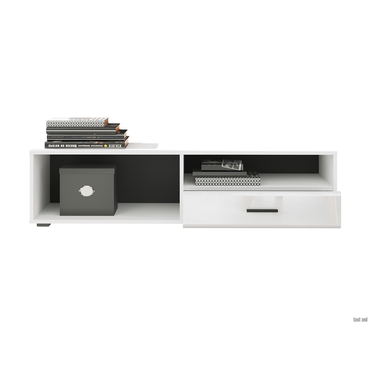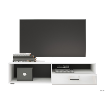 - ТВ-тумба Глосс — функциональное решение для меблировки спальни или гостиной. Открытая ниша подойдет для размещения игровой консоли, роутера или пары книг, а выдвижной ящик спрячет полезные мелочи. Универсальное белое исполнение хорошо сочетается с другой мебелью. Оригинальная дверца, снабженная газлифтом и петлями, откидывается вниз для экономии пространства. Характеристики: Материал корпуса: ЛДСП 16 мм. Материал фасада: МДФ. Материал задней стенки: ДВП черного цвета, крепление в паз. Материал ручек: пластик. Тип направляющих: шариковые длиной 35 см. Ориентация сборки: универсальная.