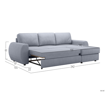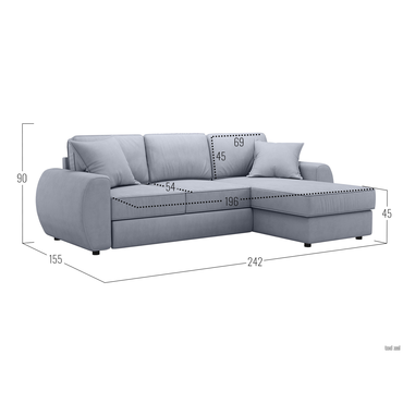 - Угловой диван Валери с оттоманкой прекрасно дополнит интерьер квартиры в классическом или современном стиле. Трехместная модель оснащена удобным механизмом трансформации, благодаря чему легко превращается в полноценное спальное место. Практичная особенность дивана — универсальная сборка на любую сторону. Обивка из прочного и приятного на ощупь велюра устойчива к повреждениям. Деревянный каркас обеспечивает надежность конструкции. Маленькие мягкие подушки, входящие в комплект дивана, создадут настоящий уют и комфорт. Характеристики: Размер спального места (ШхГ): 142 х 196 см. Механизм трансформации: дельфин. Нагрузка на одно спальное место: 120 кг. Нагрузка на одно посадочное место: 90 кг. Посадочное место (ВхГ): 45 х 54 см. Глубина дивана основной части: 87 см. Размер спального места в сложенном виде: 196 х 54 см. Размер подлокотников от пола: 61 х 22 см. Высота спинки от посадочного места: 45 см. Размер приспинных подушек: 69,5 х 45 см. Габариты дивана общие в разложенном виде (ВхШхГ): 71 х 242 х 153 см. Материал основания: Фанера, пружина змейка, ЛДСП, ДСП, ЛДВП, ДВП. Материал каркаса: дерево. Наполнение: пенополиуретан, холлкон. Наполнение подушек: поролоновая крошка. Материал ножек: пластик. Высота ножек: 3,5 см. Преимущества: механизм Дельфин — прочный и устойчивый к нагрузкам механизм. Наиболее часто применяется в угловых диванах. Для трансформации нужно вытянуть из-под широкой части дополнительную секцию с подъемным механизмом и приподнять, чтобы она сравнялась с уровнем сиденья. Подходит для ежедневного использования; ящик для хранения в оттоманке — В коробе можно с удобством хранить постельное белье и подушки или другие нужные вещи; ткань со всех сторон — диван со всех сторон обит одним материалом, поэтому будет эстетично смотреться даже в центре комнаты. Идеален для зонирования пространства и больших помещений; комфортный сон и защита стены — защищает спящего от соприкосновений с холодной стеной, а настенное покрытие — от потертостей и пятен; универсальный угол — угловая часть дивана располагается справа и слева, позволяя легко обновить интерьер и адаптировать его к новому пространству; подушки под спину — дополнительные подушки позволяют комфортно расположиться на диване, регулируя глубину посадки.