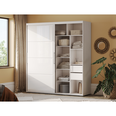 - Шкаф-купе Крафт Халф позволит максимально эффективно задействовать пространство. Внутреннее наполнение представлено секцией с продольной штангой для вешалок, полками для трикотажа и выдвижными ящиками для белья и других предметов гардероба. В антресольных нишах удобно хранить сезонные вещи, а внизу поместятся коробки с обувью. Зеркальная створка визуально увеличивает пространство и позволяет подобрать идеальный образ. Характеристики: Материал корпуса: ЛДСП. Материал фасадов: ЛДСП, стекло, зеркало. Материал ручек и штанги: металл. Материал направляющих створок: алюминий. Тип направляющих ящиков: шариковые. Тип штанги: продольная. Максимальная нагрузка на полку и штангу: 10 кг. Максимальная нагрузка на ящик: 5 кг. Ориентация сборки: универсальная. Шкаф требует много места для сборки. Конструкция шкафа предполагает сборку в горизонтальном положении. Для того чтобы шкаф можно было поднять из положения «лежа», высота потолков должна быть больше высоты шкафа не менее, чем на 10 см. Сборка шкафа в вертикальном положении гораздо более трудоемкая и часто приводит к повреждению деталей.