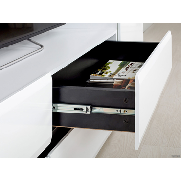 - ТВ-тумба Сидней практично и очаровательно дополнит интерьер современной гостиной или спальни. Система хранения представлена четырьмя выдвижными ящиками, каждая пара которых разделена горизонтальной черной вставкой. Аккуратные невысокие опоры позаботятся об устойчивости модели. Характеристики: Материал корпуса: ЛДСП 16 мм. Материал фасада: ЛДСП 16 мм, МДФ 16 мм. Материал опор: пластик. Тип направляющих: шариковые полного выдвижения. Максимальная нагрузка на ящик: 3 кг.