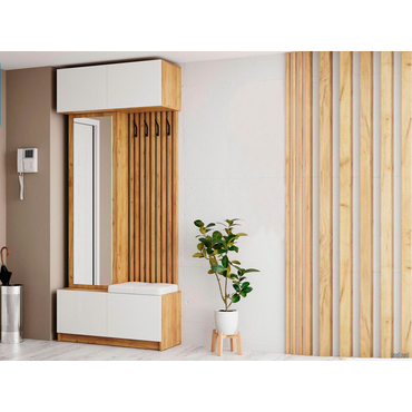 Прихожая Бостон — компактный и практичный вариант размещения верхней одежды и обуви в небольшой комнате. Модель включает несколько отделений за распашными фасадами, удобные крючки, большое зеркало и мягкое сиденье.