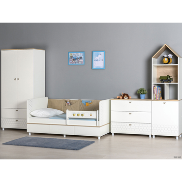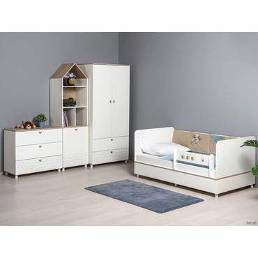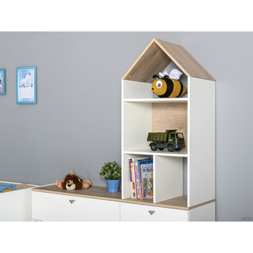 - Детский стеллаж Эйп поможет обустроить комнату в скандинавском стиле. Закрытая система хранения представления двумя высокими полками, которые удобны для хранения рюкзака, коробок с обувью и других габаритных вещей. Верхняя часть модели с очаровательным дизайном, напоминающим домик, позволит держать на виду любимые игрушки, книги и аксессуары. Благодаря регулируемым опорам стеллаж можно разместить даже на неровном полу. Характеристики: Материал: ЛДСП 16 мм с кромкой ПВХ 0,4 мм. Материал ручки: пластик. Дверцу можно навесить на любую сторону. Максимальная нагрузка на полку: 5 кг. Регулируемые опоры. Высота опор: 6 см. Рисунок выполнен методом фотопечати. Обратите внимание, стеллаж необходимо крепить к стене, чтобы исключить риск опрокидывания.
