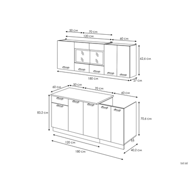- Кухонный гарнитур Хозяюшка 180 см позволит на небольшой площади организовать пространство, где будет комфортно готовить и удобно хранить посуду, бытовую технику и прочую утварь. Светлые фасады в природной гамме дополнены контрастными ручками. Такой дизайн удачно сочетается с современными интерьерами. В комплект входят (ВхШхГ): Шкаф 1 дверь + 2 двери со стеклом: 62,6 х 120 х 29 см. Шкаф 2 двери: 62,6 х 60 х 29 см. Стол под мойку: 84 х 60 х 42 см. Стол 3 двери и 1 ящиком: 84 х 120 х 42 см. Столешница: 2,6 х 120 х 60 см. Характеристики: Материал корпусов: ЛДСП. Материал фасадов: ЛДСП, стекло. Тип направляющих: роликовые. Глубина нижних шкафов: без дверок — 40 см, с дверцами — 42 см. Ручки: пластик. Опоры: регулируемые по высоте. Цвет столешницы: калаката. Толщина столешницы: 26 мм. Преимущества: Цоколь: скрывает ножки, придает кухне более завершенный эстетичный вид. За счет прилегания к полу облегчает уборку — предотвращает попадание пыли и мелкого мусора под мебель. В данном гарнитуре предусмотрен стол для накладной мойки, которая подбирается исходя из ширины модуля под мойку и глубины столешницы соседних модулей. Обратите внимание, стол под мойку не комплектуется столешницей. Мойка, сушилка и стеновая панель в комплект не входят. У гарнитура имеются зазоры для дополнительных коммуникаций.