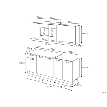 - Кухонный гарнитур Хозяюшка 200 см привлекает простым и в то же время эффектным дизайном, в котором особое внимание уделено деталям. Контрастные ручки выполняют роль акцента и подчеркивают строгую геометрию фасадов, а древесная текстура наполняет пространство теплом и уютом. За стеклом можно красиво расставить посуду, бокалы или емкости для хранения. В комплект входят (ВхШхГ): Шкаф 1 дверь + 2 двери со стеклом: 62,6 х 120 х 29 см. Шкаф 2 двери: 62,6 х 80 х 29 см. Стол под мойку: 84 х 80 х 42 см. Стол 3 двери и 1 ящик: 84 х 120 х 42 см. Столешница: 2,6 х 120 х 60 см. Характеристики: Материал корпусов: ЛДСП. Материал фасадов: ЛДСП, стекло. Тип направляющих: роликовые. Глубина нижних шкафов: без дверок — 40 см, с дверцами — 42 см. Ручки: пластик. Опоры: регулируемые по высоте. Цвет столешницы: калаката. Толщина столешницы: 26 мм. Преимущества: Цоколь: скрывает ножки, придает кухне более завершенный эстетичный вид. За счет прилегания к полу облегчает уборку — предотвращает попадание пыли и мелкого мусора под мебель. В данном гарнитуре предусмотрен стол для накладной мойки, которая подбирается исходя из ширины модуля под мойку и глубины столешницы соседних модулей. Обратите внимание, стол под мойку не комплектуется столешницей. Мойка, сушилка и стеновая панель в комплект не входят. У гарнитура имеются зазоры для дополнительных коммуникаций.