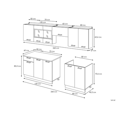 - В кухонном гарнитуре Хозяюшка 260 см есть всё необходимое для удобного хранения посуды, техники и прочей утвари, а также комфортного приготовления пищи. Контрастные детали оживляют лаконичные фасады, а древесная текстура наполняет пространство уютом. В комплект входят (ВхШхГ): Шкаф 1 дверь + 2 двери со стеклом: 62,6 х 120 х 29 см. Шкаф антресольный: 31,3 х 60 х 29 см. Шкаф 2 двери: 62,6 х 80 х 29 см. Стол под мойку: 84 х 80 х 42 см. Стол 3 двери и 1 ящик: 84 х 120 х 42 см. Столешница: 2,6 х 120 х 60 см. Характеристики: Материал корпусов: ЛДСП. Материал фасадов: ЛДСП, стекло. Тип направляющих: роликовые. Глубина нижних шкафов: без дверок — 40 см, с дверцами — 42 см. Ручки: пластик. Опоры: регулируемые по высоте. Цвет столешницы: калаката. Толщина столешницы: 26 мм. Преимущества: Цоколь: скрывает ножки, придает кухне более завершенный эстетичный вид. За счет прилегания к полу облегчает уборку — предотвращает попадание пыли и мелкого мусора под мебель. В данном гарнитуре предусмотрен стол для накладной мойки, которая подбирается исходя из ширины модуля под мойку и глубины столешницы соседних модулей. Обратите внимание, стол под мойку не комплектуется столешницей. Мойка, сушилка и стеновая панель в комплект не входят. У гарнитура имеются зазоры для дополнительных коммуникаций.
