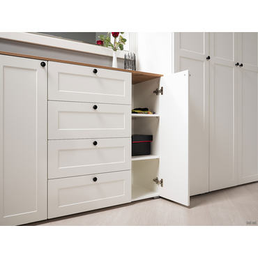 - Комод Остин — стильное и практичное решение для оформления интерьера и организации пространства. Комбинированное наполнение предусматривает четыре выдвижных ящика по центру и два отделения с полками за распашными дверцами. Ящики оснащены направляющими скрытого монтажа, что обеспечит выдвижение на всю глубину, плавный бесшумный ход и длительный срок эксплуатации. Опоры регулируются по высоте, что позволит разместить комод на полу с неровностями. Характеристики: Материал корпуса: ЛДСП. Материал фасадов: МДФ. Материал ручек: пластик. Тип направляющих: шариковые с доводчиком. Внутренние габариты ящика (ВхШхГ): 13,7 х 59,7 х 23,6 см. Петли оснащены доводчиком. Опоры регулируются по высоте.
