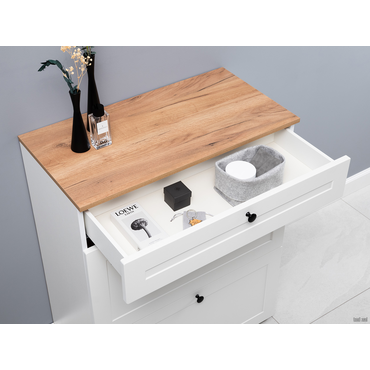 - Обувница Остин — практичное решение для компактного хранения нескольких пар обуви в небольшой прихожей. Для быстрого доступа к полезным мелочам предусмотрен небольшой ящик, который оснащен направляющими скрытого монтажа, что обеспечит выдвижение на всю глубину, плавный бесшумный ход и длительный срок эксплуатации. Регулируемые опоры позволяют разместить модель даже на полу с неровностями. Характеристики: Материал корпуса: ЛДСП. Материал фасадов: МДФ. Материал ручек: пластик. Внутренние габариты ящика (ВхШхГ): 10,5 х 73,8 х 29,8 см. Механизм открывания: откидной. Тип направляющих: шариковые с доводчиком. Вместимость: 12 пар. Опоры регулируются по высоте.