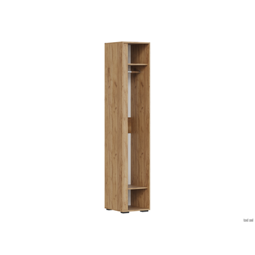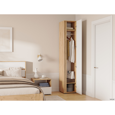 - Распашной шкаф Элли — компактная модель для хранения одежды. Небольшие габариты позволяют установить пенал даже в ограниченном пространстве. Внутри есть ниша со штангой и пара полок для сложенных вещей. Дверца закрывается плавно и бесшумно, поэтому пользоваться шкафом очень комфортно. Характеристики: Материал: ЛДСП. Тип штанги: продольная. Дверцу можно навесить на любую сторону. Высота опор: 2 см.