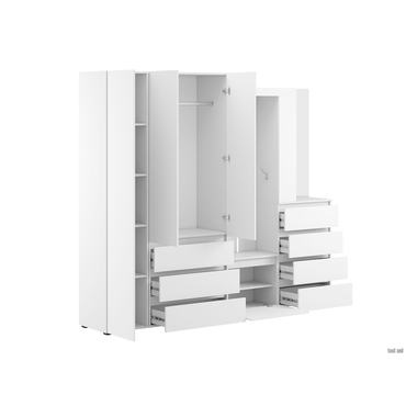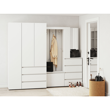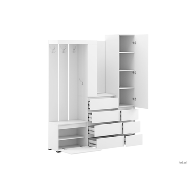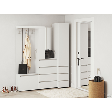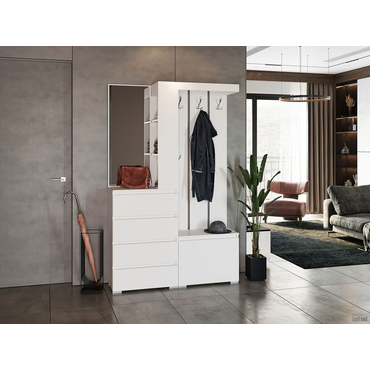 - Прихожая Элли — стильный и практичный модуль, в котором продумана каждая деталь. Рядом с зеркалом расположены полочки для косметики, парфюма и аксессуаров, а в ящиках есть место для шарфов, перчаток и ключей. Панель с крючками для верхней одежды дополнена обувницей. Плавный ход ящиков делает прихожую еще удобнее. Характеристики: Материал корпуса: ЛДСП. Материал фасадов: ЛДСП, зеркало. Механизм открывания: распашной, откидной. Тип направляющих: шариковые. Вместимость обувницы: 4 пары. Ориентация сборки: универсальная. Требуется крепление к стене. Крепежи входят в комплект.