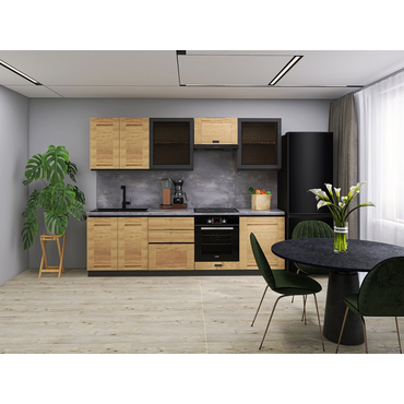 - Кухонный гарнитур Сити 260 см подойдет для ценителей мебели в стиле лофт. Компактные функциональные элементы помогут максимально эффективно организовать пространство, сохраняя чистоту и порядок. Дверцы со стеклянными вставками откроют обзор на содержимое, защищая его от пыли и влаги. Выдвижные ящики оснащены шариковыми направляющими для плавного бесшумного хода. Специальная ниша поможет разместить духовой шкаф. Цоколь предотвратит попадание мусора и мелких предметов под мебель. В комплект входят (ВхШхГ): Стол под мойку 2 двери: 82 х 80 х 47 см. Стол 3 ящика: 82 х 60 х 47 см. Стол под духовой шкаф: 82 х 60 х 47 см. Стол 1 дверь: 82 х 60 х 47 см. Шкаф 2 двери: 72 х 80 х 32 см. Шкаф 1 дверь стекло, 2 шт.: 72 х 60 х 32 см. Шкаф под вытяжку: 36 х 60 х 32 см. Цоколь: 9,5 х 275 х 1,6 см. Профиль-ручка между ящиками: 8 х 13,5 х 3 см. Верхняя Профиль-ручка: 5,8 х 27,5 х 3 см. Верхняя Профиль-ручка: 5,8 х 13,5 х 3 см. Характеристики: Материал корпусов: ЛДСП 16 мм. Материал фасадов: ЛДСП, МДФ в черной пленке, стекло 4 мм с шелкографией. Фурнитура антресольного шкафа: подъемник с газовым кронштейном. Фурнитура дверок: накладные петли без доводчиков. Направляющие ящиков: шариковые без доводчиков. Опоры: 10 см, регулируемые по высоте. Максимальная нагрузка на полку: 20 кг. Максимальная нагрузка на ящик: 10 кг. Преимущества: цоколь — скрывает ножки, придает кухне более завершенный эстетичный вид. За счет прилегания к полу облегчает уборку — предотвращает попадание пыли и мелкого мусора под мебель. Обратите внимание, столешницу, мойку и стеновую панель необходимо приобрести отдельно.