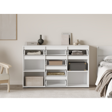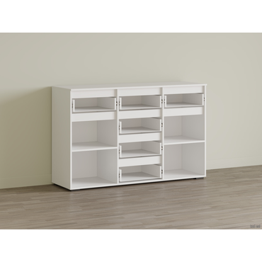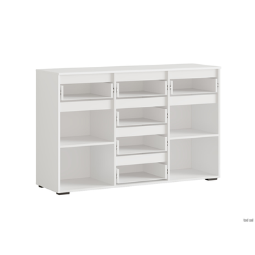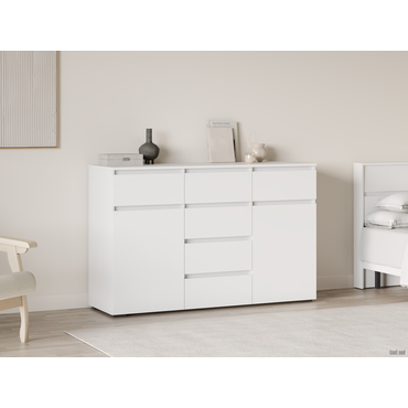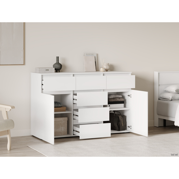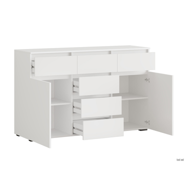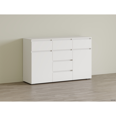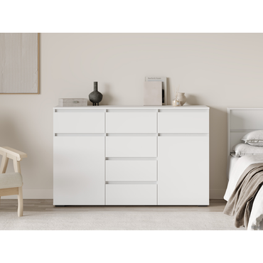 - Комод Элли — незаменимый помощник в поддержании порядка. Выдвижные ящики и отделения с полками организуют максимально удобную систему хранения. Подчеркнуто лаконичное оформление удачно сочетается с разными интерьерами. Комод достаточно широкий и вместительный, поэтому подходит для просторных комнат. Характеристики: Материал: ЛДСП. Внутренние габариты центральных ящиков (ВхШхГ): 11 х 42 х 38,4 см. Внутренние габариты боковых ящиков (ВхШхГ): 11 х 42,8 х 38,4 см. Тип направляющих: шариковые. Максимальная нагрузка на ящик: 2 кг.