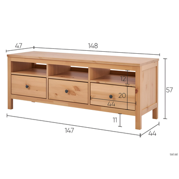 - ТВ-тумба Кымор — практичная модель из прочного массива дерева. Широкая столешница позволит разместить телевизор большой диагонали. В ящиках можно спрятать разные мелочи, зарядные устройства и аксессуары для техники. Благодаря высоким ножкам тумба не выглядит громоздко. Характеристики: Материал: массив сосны. Материал ручек: металл. Тип направляющих: роликовые без доводчиков. Максимальная нагрузка на ящик: 20 кг. Максимальная нагрузка на столешницу: 50 кг. Внутренний размер ящика (ШхГхВ): 39,6 х 38,2 х 17 см. Обратите внимание! Из-за особенностей материала во избежание повреждения мебели сборку необходимо осуществлять на ковре или другой мягкой поверхности.