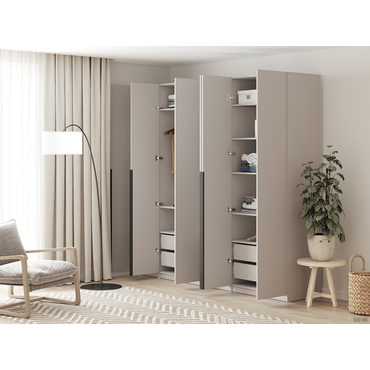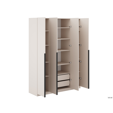 - Распашной шкаф Арно 4 двери — вместительная модель, с которой легко организовать максимально удобную систему хранения. Можно выбрать один из двух вариантов наполнения: с просторной нишей по центру или с ящиками для белья и аксессуаров. В дизайне сделан акцент на простую геометрию, которую подчеркивают тонкие контрастные ручки. В комплектацию С антресолью входят (ВхШхГ): Шкаф: 221,6 х 160,1 х 50,6 см. Антресоль: 38,4 х 160,1 х 50,6 см. Характеристики: Материал: ЛДСП. Материал ручек: пластик. Тип направляющих: шариковые. Тип штанги: продольная. Максимальная нагрузка на полку: 5 кг. Ориентация сборки: только так, как показано на изображении. Дверцы шкафа оснащены доводчиками. Дверцы антресоли оснащены толкателем, открываются нажатием. Габариты антресоли (ВхШхГ): 38,4 х 80,1 х 50,6 см. Обратите внимание, штанга есть во всех комплектациях гардеробной системы. Шкаф требует много места для сборки. Конструкция шкафа предполагает сборку в горизонтальном положении. Для того, чтобы шкаф можно было поднять из положения «лежа», высота потолков должна быть больше высоты шкафа не менее, чем на 10 см. Сборка шкафа в вертикальном положении гораздо более трудоемкая и часто приводит к повреждению деталей.