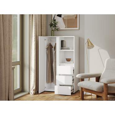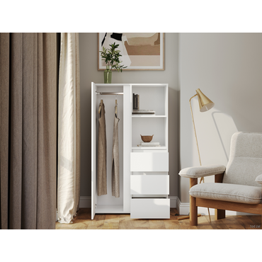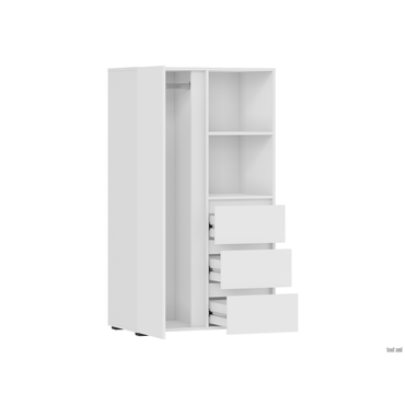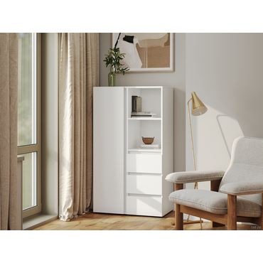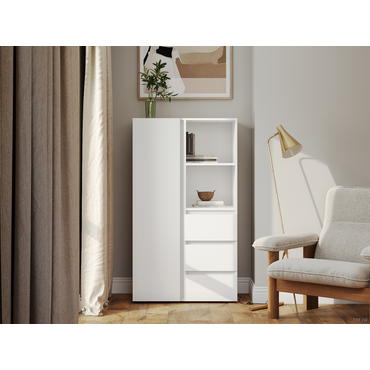 - Стеллаж Элли с дверцей и ящиками организует комфортное хранение различных вещей. Универсальная модель украсит пространство гостиной, прихожей или спальни. Открытые ниши подходят для размещения статуэток, фоторамок и другого декора, который придает интерьеру индивидуальность. Характеристики: Материал: ЛДСП. Максимальная нагрузка на полку: 5 кг. Ориентация сборки: только так, как показано на изображении. Требуется крепление к стене. Фурнитура входит в комплект. Тип направляющих: шариковые.