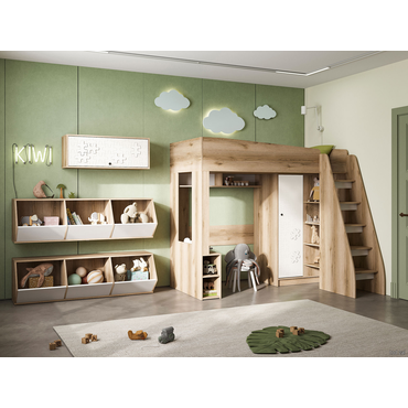 - Детская полка Киви — универсальная модель для хранения учебников, школьных принадлежностей и других важных вещей. Она поможет сэкономить пространство благодаря навесной конструкции. Необычная фрезеровка на фасаде станет очаровательным акцентом интерьера. Характеристики: Материал корпуса: ЛДСП. Материал фасада: МДФ. Материал ручки: металл.