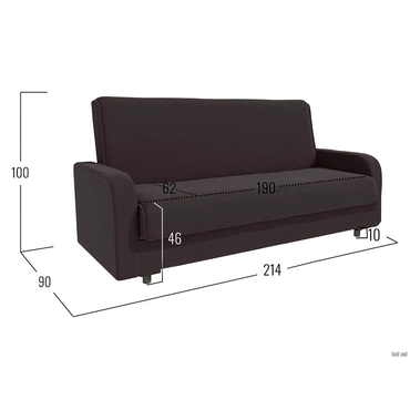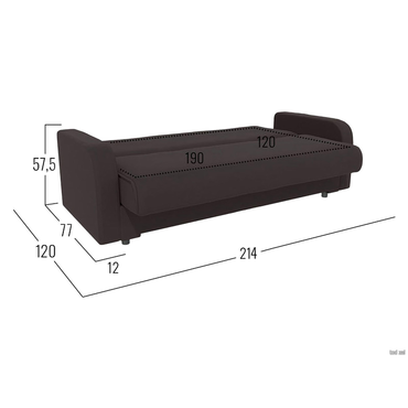 - Прямой диван Конти с подлокотниками — компактная и удобная модель. Простой силуэт и минималистичный дизайн делают диван универсальным дополнением любого современного интерьера. Низкие округлые подлокотники способствуют более комфортному отдыху. Надежный раскладной механизм позволяет без особых усилий трансформировать модель в ровное спальное место. Для постельных принадлежностей предусмотрен бельевой короб в основании. Характеристики: Размер спального места: 120 х 190 см. Размер спального места в сложенном виде: 62 х 190 см. Механизм трансформации: книжка. Нагрузка на одно спальное место: 90 кг. Нагрузка на одно посадочное место: 70 кг. Посадочное место (ВхГ): 46 х 62 см. Высота спинки от посадочного места: 54 см. Размер подлокотников (ВхШ): 57,5 х 12 х 77 см. Размер ящика для белья (ВхШ): 75 х 180 см. Общие габариты дивана в разложенном виде (ВхШхГ): 57,5 х 212 х 120 см. Материал основания: массив, фанера, ДСП, ХДФ. Наполнитель: независимый пружинный блок 8 см, войлок, ортопена 2 см. Тип каркаса: деревянный. Материал ножек: пластик. Высота ножек: 10 см. Преимущества: механизм трансформации «Книжка» — чтобы разложить диван, нужно приподнять сиденье до характерного щелчка (при этом спинка принимает горизонтальное положение) и опустить обратно. Для трансформации необходимо небольшое пространство между спинкой и стеной. Подходит для ежедневной эксплуатации; высокие ножки — упрощают уборку под диваном и делают конструкцию визуально легче; независимый пружинный блок — каждая пружина находится в отдельном тканевом чехле и не связана с другими. Это обеспечивает точечное распределение нагрузки и оптимальную поддержку каждой части тела. Подходит для ежедневного сна; антикоготь — гладкая текстура ткани более устойчива к появлению зацепок, в отличие от материалов с выраженным плетением. Кроме того, она легко чистится от шерсти; двойной ящик для хранения — в коробе с перегородкой удобно хранить постельные принадлежности, сезонные вещи и другие предметы отдельно друг от друга.