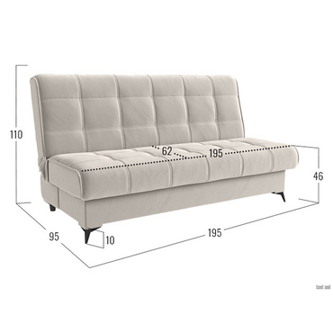 - Прямой диван Теон впишется в любой современный интерьер. Двойная строчка служит декоративным акцентом и защищает обивку от растягивания. Простой силуэт и элегантные ножки создают визуально легкий облик, который не перегружает интерьер. Надежный механизм трансформации подходит для ежедневного использования. Диван легко и быстро раскладывается, образуя комфортабельное спальное место. Бельевой ящик под сиденьем отлично подходит для постельных принадлежностей и других необходимых вещей. Характеристики: Размер спального места: 135 х 195 см. Размер спального места в сложенном виде: 62 х 195 см. Механизм трансформации: книжка. Нагрузка на одно спальное место: 90 кг. Нагрузка на одно посадочное место: 70 кг. Посадочное место (ВхГ): 46 х 62 см. Высота спинки от посадочного места: 68 см. Размер ящика (ВхШ): 75,5 х 186 см. Общие габариты дивана в разложенном виде (ВхШхГ): 45 х 195 х 135 см. Материал основания: массив, фанера, ДСП, ХДФ. Наполнитель дивана: независимый пружинный блок 8 см, войлок, ортопена 2 см. Наполнитель приспинных подушек: ортопена. Тип каркаса: деревянный. Материал ножек: сталь/пластик. Высота ножек: 10 см. Преимущества: механизм трансформации «Книжка» — чтобы разложить диван, нужно приподнять сиденье до характерного щелчка (при этом спинка принимает горизонтальное положение) и опустить обратно. Для трансформации необходимо небольшое пространство между спинкой и стеной. Подходит для ежедневной эксплуатации; независимый пружинный блок — каждая пружина находится в отдельном тканевом чехле и не связана с другими. Это обеспечивает точечное распределение нагрузки и оптимальную поддержку каждой части тела. Подходит для ежедневного сна; двойной ящик для хранения — в коробе с перегородкой удобно хранить постельные принадлежности, сезонные вещи и другие предметы отдельно друг от друга; высокие ножки — ножки упрощают уборку под диваном и делают конструкцию визуально легче; легкая сборка — собрать мебель можно, не прибегая к услугам специалистов. Всё, что нужно, — отвертка и немного свободного времени.