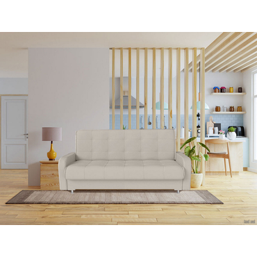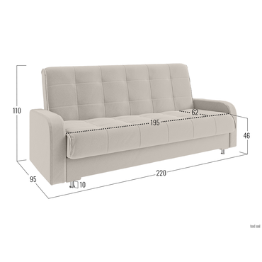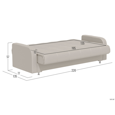- Прямой диван Норман украсит интерьер гостиной, спальни или детской. Дизайн с симметричной прострочкой подчеркивает лаконичный силуэт модели и адаптируется под разные интерьерные стили. Благодаря простому механизму диван легко раскладывается и образует ровное спальное место. Бельевой короб подходит для хранения различных принадлежностей. Характеристики: Размер спального места: 135 х 195 см. Размер спального места в сложенном виде: 62 х 195 см. Механизм трансформации: книжка. Нагрузка на одно спальное место: 90 кг. Нагрузка на одно посадочное место: 70 кг. Посадочное место (ВхГ): 46 х 62 см. Размер подлокотников (ВхШ): 57 х 77 см. Размер ящика: 75,5 х 190 см. Общие габариты в разложенном виде (ВхШхГ): 46 х 220 х 135 см. Материал основания: массив, фанера, ДСП, ХДФ. Наполнитель дивана: независимый пружинный блок 8 см, войлок, ортопена 2 см. Тип каркаса: деревянный. Материал ножек: хром / пластик. Высота ножек: 10 см. Преимущества: механизм трансформации «Книжка» — чтобы разложить диван, нужно приподнять сиденье до характерного щелчка (при этом спинка принимает горизонтальное положение) и опустить обратно. Для трансформации необходимо небольшое пространство между спинкой и стеной. Подходит для ежедневной эксплуатации; независимый пружинный блок — каждая пружина находится в отдельном тканевом чехле и не связана с другими. Это обеспечивает точечное распределение нагрузки и оптимальную поддержку каждой части тела. Подходит для ежедневного сна; антикоготь — гладкая текстура ткани более устойчива к появлению зацепок, в отличие от материалов с выраженным плетением. Кроме того, она легко чистится от шерсти; ящик для хранения — в просторном коробе уместится все: от постельного белья и объемных подушек до сезонных вещей и коробок с обувью.; высокие ножки — ножки упрощают уборку под диваном и делают конструкцию визуально легче.
