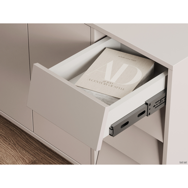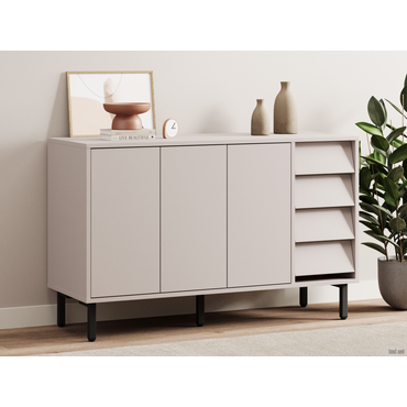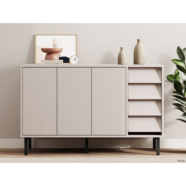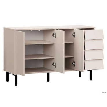- Комод Степ — элегантная модель для хранения в гостиной, спальне или прихожей. Комбинация распашных секций и выдвижных ящиков позволяет поддерживать порядок в любых вещах. Сочетание лаконичных фасадов и металлических опор гармонично смотрится в современной обстановке и не загромождает интерьер лишними деталями. Характеристики: Материал корпуса и фасадов: ЛДСП 16 мм. Материал ножек: металл. Тип направляющих: шариковые полного выдвижения. Механизм открывания дверок: «push-to-open». Ориентация сборки: только так, как показано на изображении. Максимальная нагрузка на полку и ящик: 5 кг. Высота ножек: 14 см.
