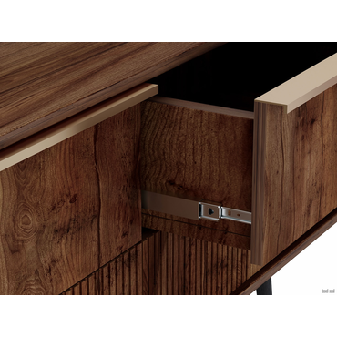 - ТВ-тумба Луиджи добавит стильный акцент в оформление интерьера. Фрезеровка на фасадах и фурнитура золотого оттенка создают аристократичный облик модели. Вместительные ящики позволяют разместить внутри необходимые вещи: от предметов одежды до папок с документами. Наличие высоких ножек облегчает уборку под тумбой. Характеристики: Материал корпуса: ЛДСП. Материал фасада: МДФ в пленке ПВХ. Материал ручек и опор: металл. Тип направляющих: шариковые. Максимальная нагрузка на ящик: 7 кг. Максимальная нагрузка на столешницу: 30 кг. Высота опор: 20 см.