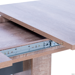 - Для ежедневного приёма пищи достаточно небольшого стола. А раздвижной стол — лучшее решение на случай гостей. В разложенном состоянии за ним может с комфортом разместиться до 6 человек. «Гранд» — самая универсальная модель в серии. Этот стол не только впишется в любой интерьер, но и заставит его выглядеть дороже, благодаря качественной имитации массива. В разложенном виде, длина стола - 1600 мм.