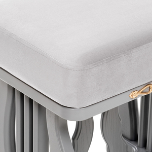 - Банкетка с мягким сидением и изогнутыми опорами необычной формы выполнена из массива дерева. Сиденье обтянуто мебельной тканью высокого качества. Надежные опоры банкетки придают ей устойчивость. Банкетка станет отличным дополнением к туалетному столику «Джульетта».