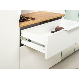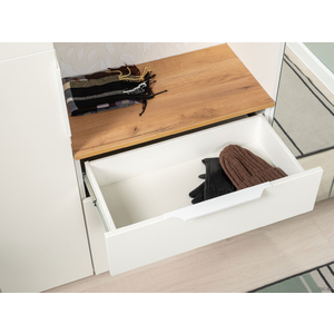 Обувница Октава — это актуальный дизайн и удобное хранение. В секции с откидной дверцей можно разместить несколько пар невысокой обуви, а в ящике — перчатки, запасные ключи и другие мелочи. Гладкие фасады и лаконичная фурнитура подчеркивают современный стиль модели.