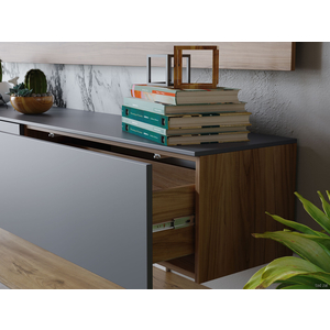 Гостиная Порто позволит оформить зону ТВ в актуальном минималистичном стиле. Гладкие матовые фасады с эффектом «soft-touch» приятны тактильно, не бликуют и отлично сочетаются с каркасом в древесном декоре. Вместительные модули для хранения помогают поддерживать порядок в гостиной.
