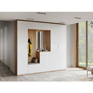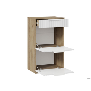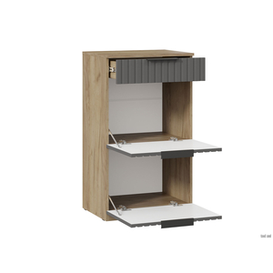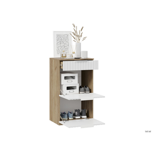 Обувница Хилтон экономит пространство прихожей, организуя компактное хранение всего необходимого. Две вместительные полки оснащены откидными дверцами с широкими металлическими ручками. Небольшой выдвижной ящик предусмотрен для различных мелочей.