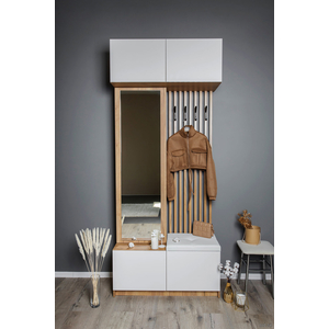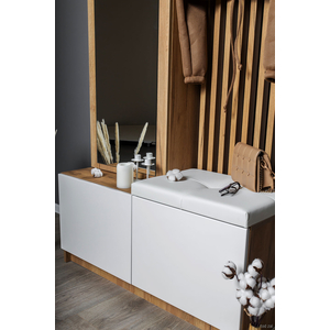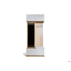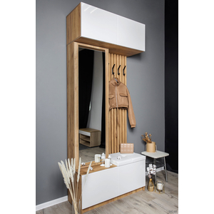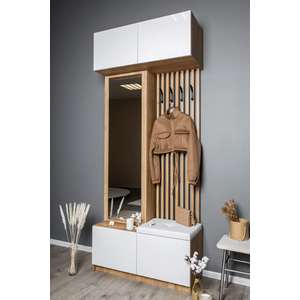 Прихожая Бостон — компактный и практичный вариант размещения верхней одежды и обуви в небольшой комнате. Модель включает несколько отделений за распашными фасадами, удобные крючки, большое зеркало и мягкое сиденье.