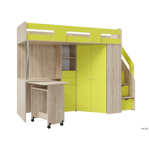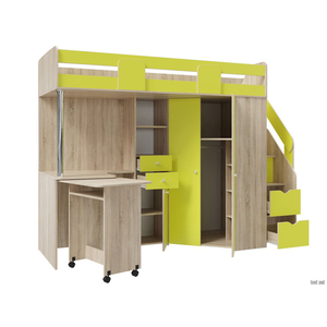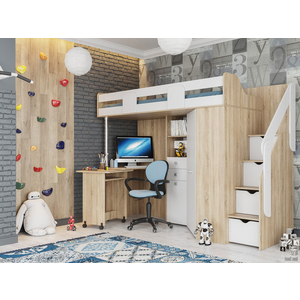 Кровать-чердак Мийа — мультифункциональная модель с акцентом на комфорт и безопасность ребенка. Выдвижная конструкция стола, ящики в ступенях лестницы и угловой шкаф позволяют максимально рационально задействовать пространство. В мебели практически нет острых углов, что снижает риск случайных травм. Дизайн и цветовое решение подходят для оформления комнаты как мальчика, так и девочки.