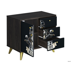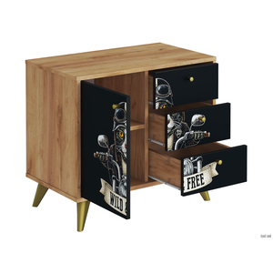 Комод Фьюжн станет стильным акцентом в интерьере и поможет аккуратно хранить постельное белье, сложенную одежду и личные вещи. Комбинированное наполнение представлено тремя выдвижными ящиками на роликовых направляющих и отделением с полками, скрытым за распашной дверцей. Качественная фотопечать придаст изделию эффектный винтажный вид. Высокие опоры позволят разместить изделие вплотную к стене, а также упростят уборку в помещении.
