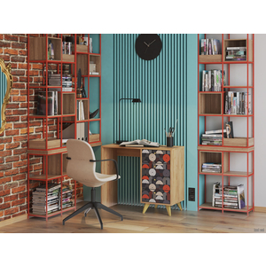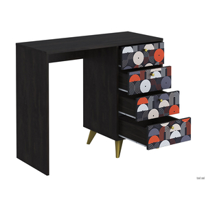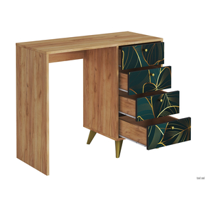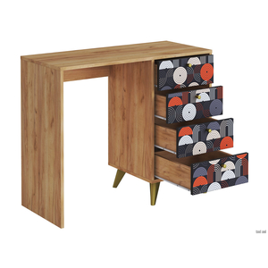Письменный стол Фьюжн поможет создать компактное и комфортабельное рабочее или учебное пространство в небольшом помещении. Модель дополнена тумбой с четырьмя выдвижными ящиками на роликовых направляющих, что позволит хранить в легкой доступности канцелярские принадлежности, документы формата А4 и личные вещи. Фасады украшены стильной фотопечатью, которая дарит мебели эффектный винтажный вид. Высокие опоры облегчат уборку.