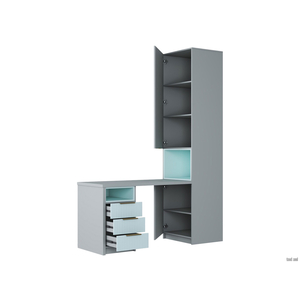 Детский письменный стол Джерси станет практичным решением для комнаты ребенка. Высокий шкаф и тумба с ящиками создают удобное пространство, где малыш может делать уроки и держать под рукой нужные учебники и тетради. Акцентные ручки на выдвижных ящиках — изюминка стола.