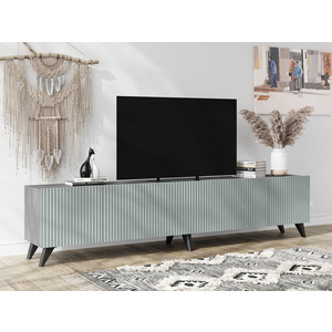 ТВ-тумба Сканди позволит расположить телевизор любой диагонали, мультимедийную технику и найти место для различных предметов обихода. Вертикальный декор на фасадах создает акцентный элемент интерьера. Дверцы открываются за специальные выступы, что заменяет лицевую фурнитуру.